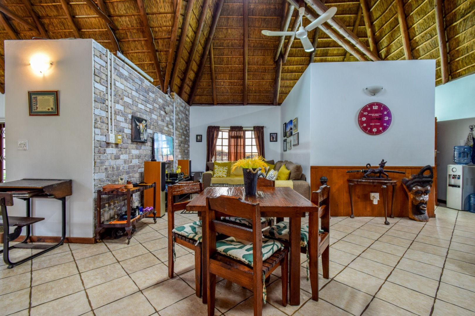 The interior boasts multiple living areas designed for both relaxation and entertaining, including a comfortable lounge, a dedicated family TV room, and a dining room, all benefiting from an open-plan layout with a fireplace. The well-appointed kitchen includes a gas hob, a pantry and a separate laundry/scullery area, catering to all culinary needs. Additional versatile spaces such as a study/loft and a store room enhance the home's practicality. A significant advantage is the separate one-bedroom flatlet, providing ideal accommodation for extended family or guests.