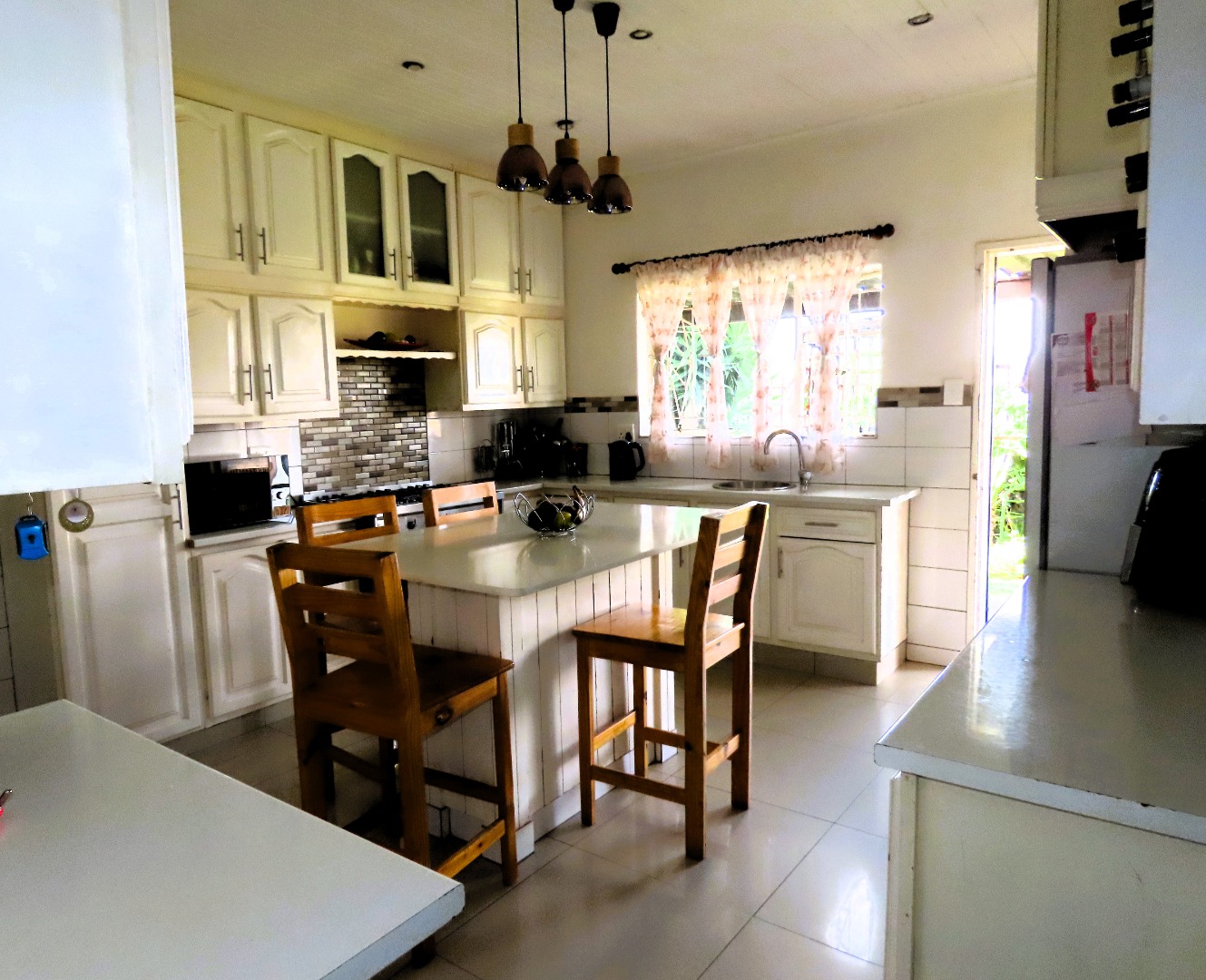 Step inside and feel right at home. The house boasts a generous 420 sqm floor size, offering two comfortable lounges and a family TV room, perfect for relaxing or entertaining. The open-plan design creates a lovely flow, complemented by bright tiled floors and large windows that let in plenty of natural light. The dining room is ready for family meals, and the bright kitchen is a real highlight, featuring off-white cabinetry, a functional island with bar seating, and modern pendant lighting – ideal for whipping up your favourite dishes.