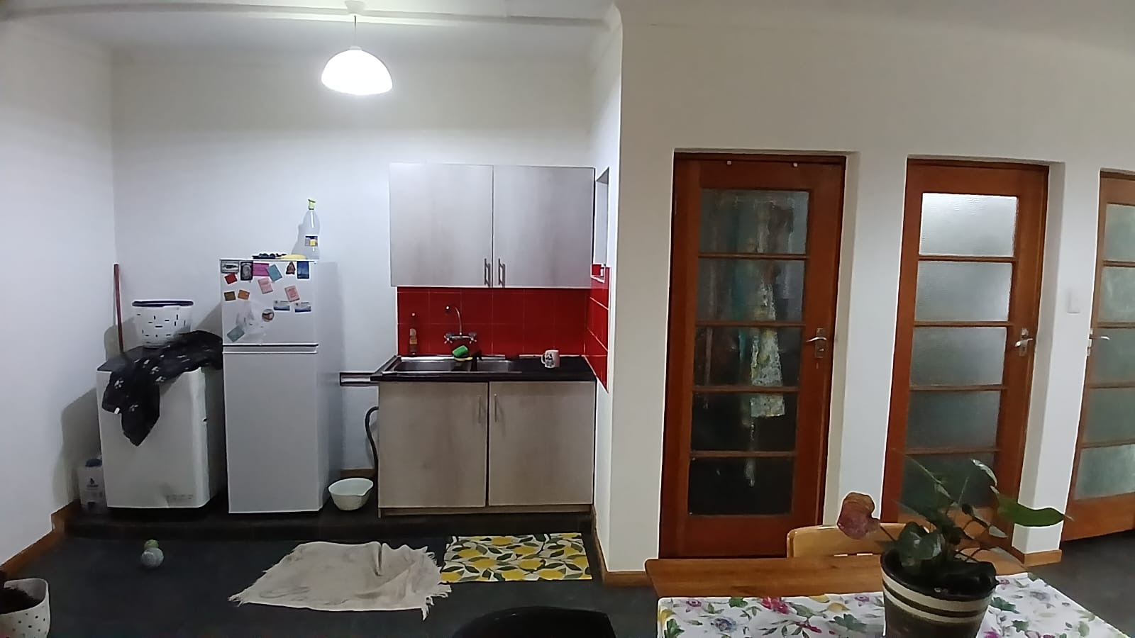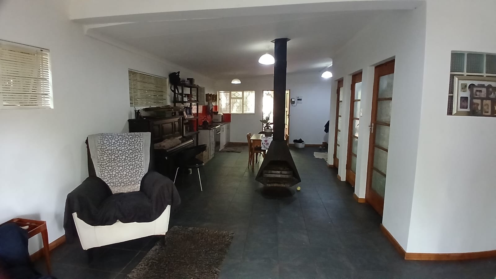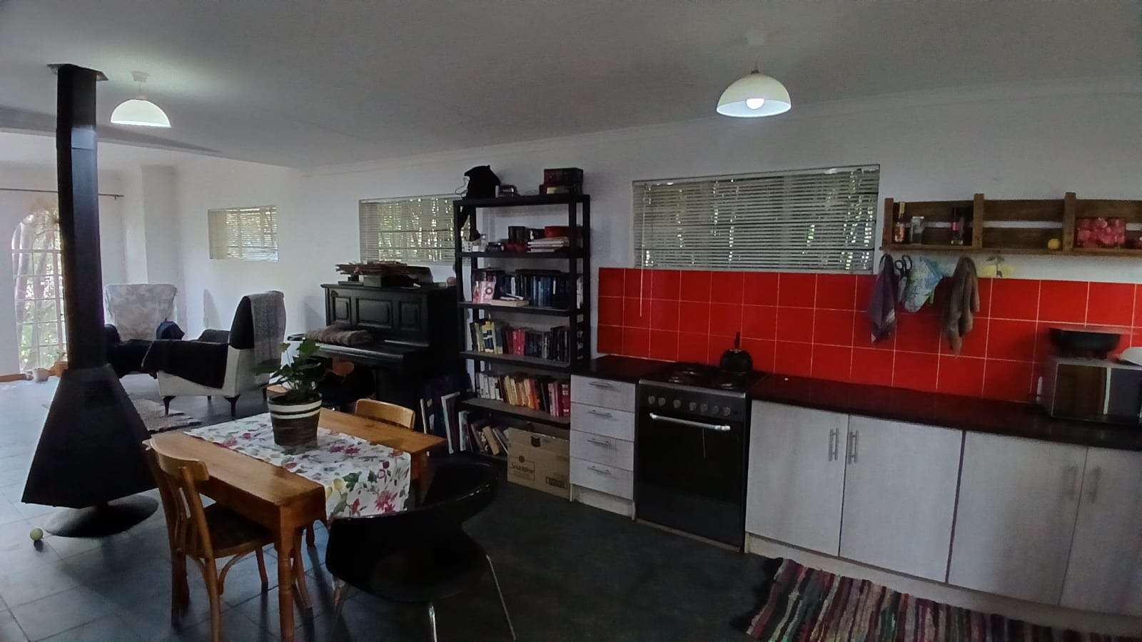 Discover this inviting 1-bedroom, 1-bathroom rental property located in the serene Vlakplaats area of Centurion, offering a unique lifestyle farm experience. The residence features a spacious open-plan layout, seamlessly integrating the lounge, dining area, and a functional kitchen. A prominent freestanding industrial-style fireplace provides warmth and character, complemented by white walls and durable dark tiled flooring. The kitchen boasts modern silver-grey cabinets and a distinctive red tiled backsplash, equipped for everyday living.