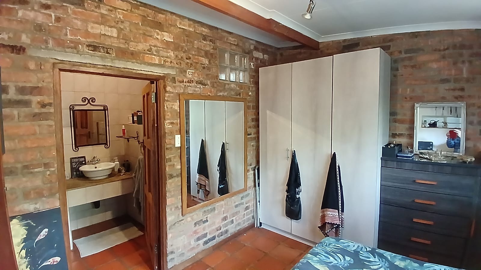 The charming bedroom showcases exposed brick walls and warm terracotta tile flooring, alongside a practical built-in wardrobe and direct access to a private en-suite bathroom with rustic finishes. Natural light filters through glass block windows, enhancing the room's unique character. This property is ideal for individuals or couples seeking a peaceful retreat where small pets are welcome.