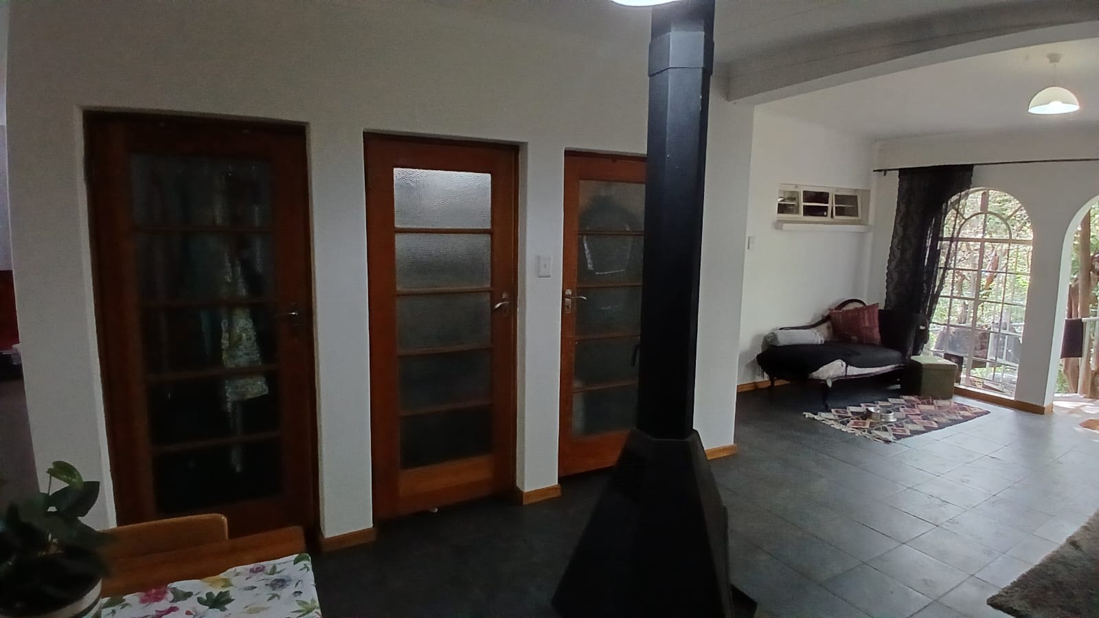 Discover this inviting 1-bedroom, 1-bathroom rental property located in the serene Vlakplaats area of Centurion, offering a unique lifestyle farm experience. The residence features a spacious open-plan layout, seamlessly integrating the lounge, dining area, and a functional kitchen. A prominent freestanding industrial-style fireplace provides warmth and character, complemented by white walls and durable dark tiled flooring. The kitchen boasts modern silver-grey cabinets and a distinctive red tiled backsplash, equipped for everyday living.