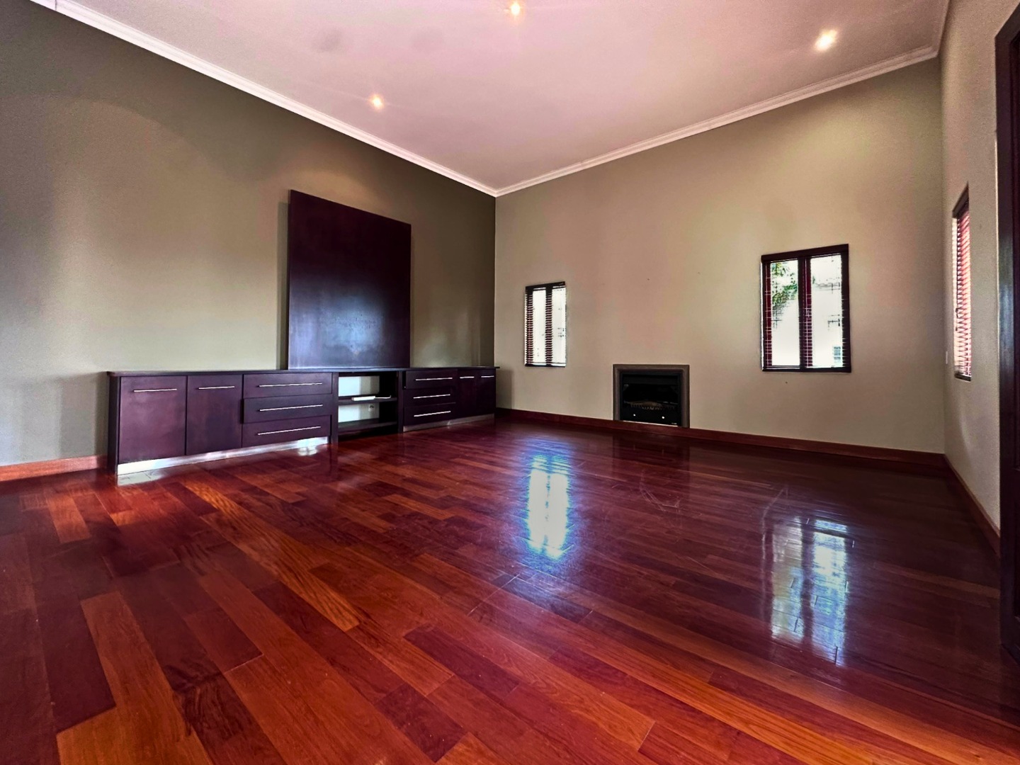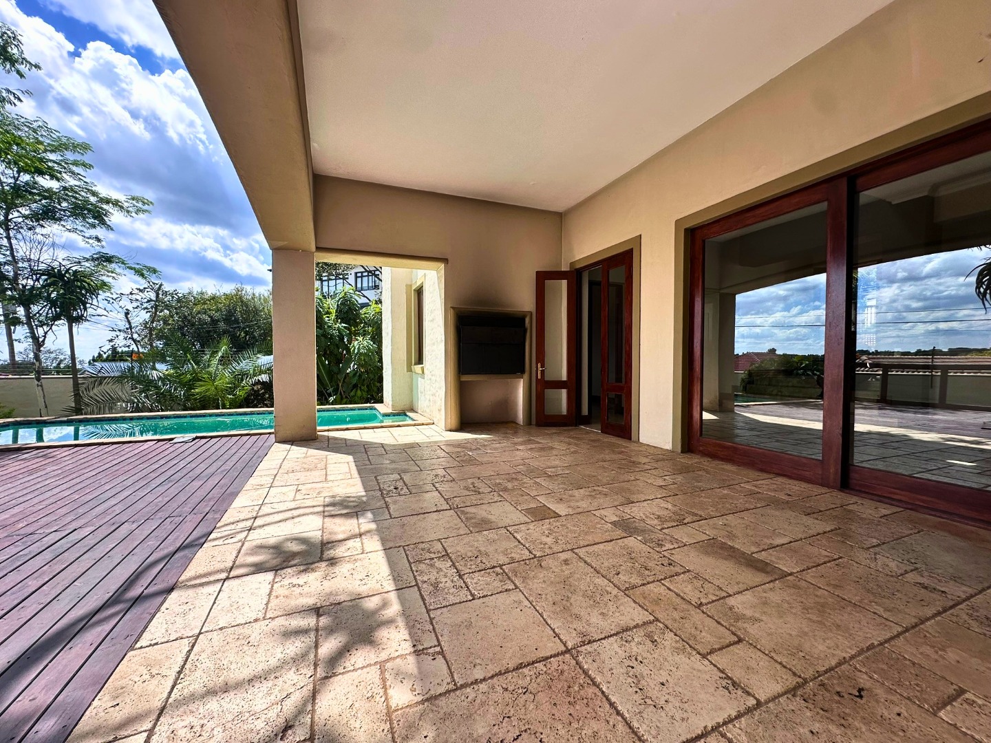 The ground floor is centered around a sleek open plan kitchen with ample cupboard space, a walk-in pantry and a separate scullery with room for all wet appliances. The kitchen flows into the dining and living areas, creating a practical layout for everyday family life. Two lounges, both with fireplaces, add flexibility and warmth, while the covered veranda with built-in braai opens beautifully from the lounge through wooden glass doors, overlooking the sparkling pool and private garden setting.