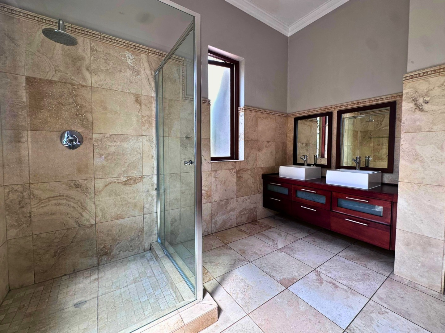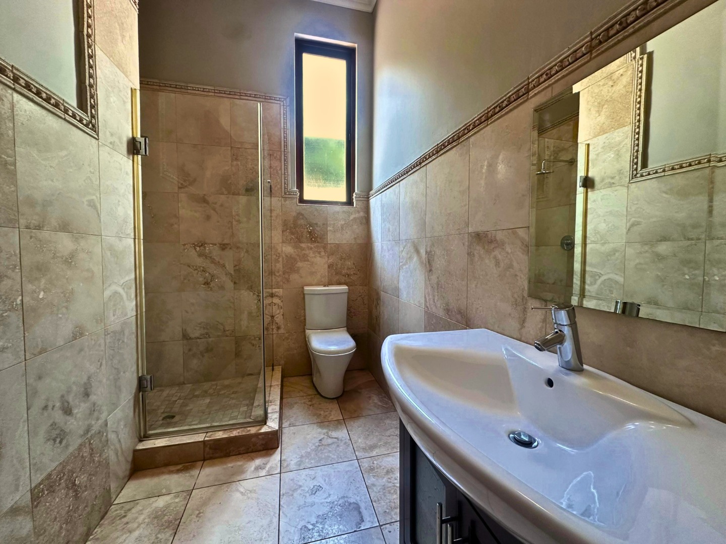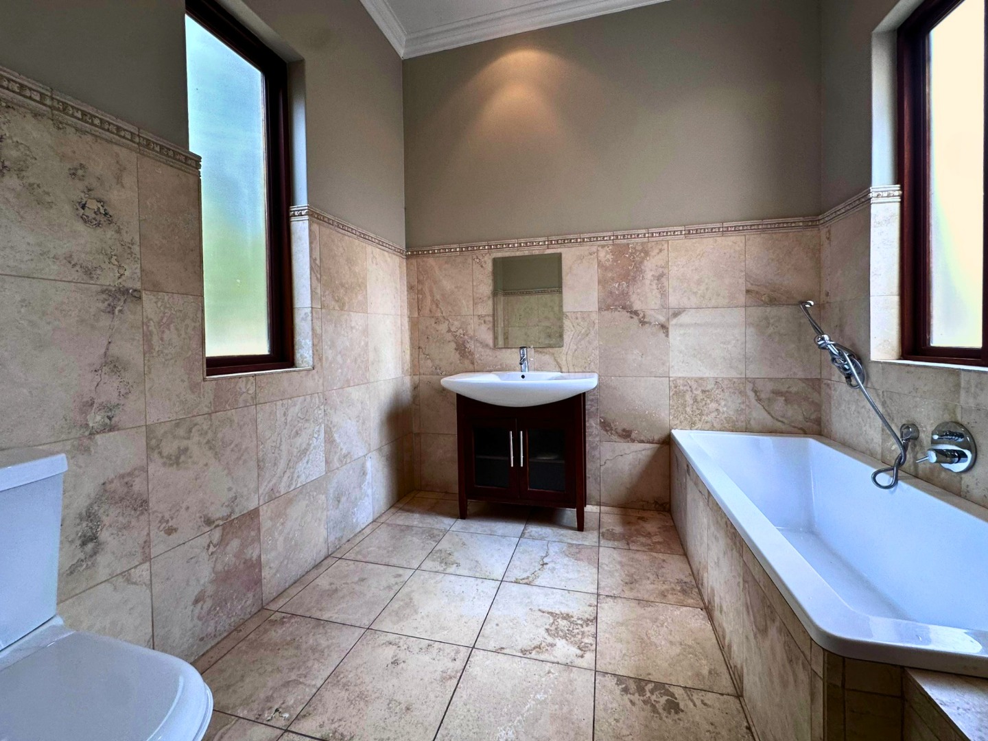 Upstairs, the home offers four well-sized bedrooms and a strong focus on comfort. There are two generous main-style bedrooms, each with its own en-suite bathroom, while one also enjoys a walk-in closet and access to a balcony with lovely views. The remaining two bedrooms have built-in cupboards, open onto a balcony, and share a bathroom with a shower over the bath.