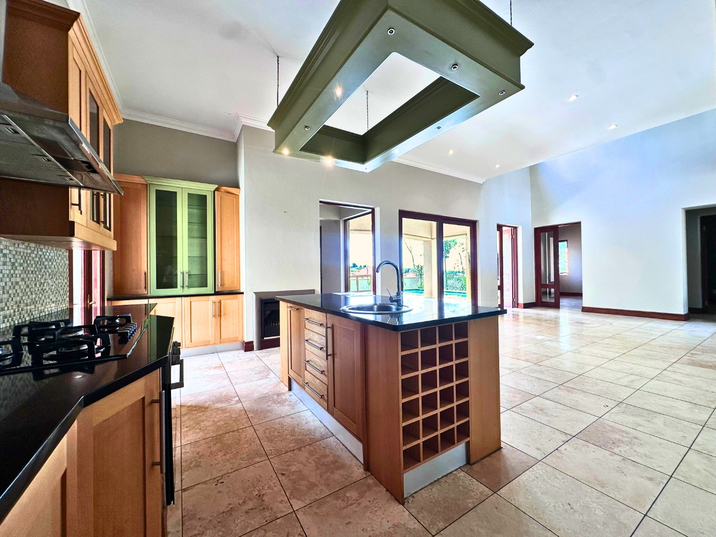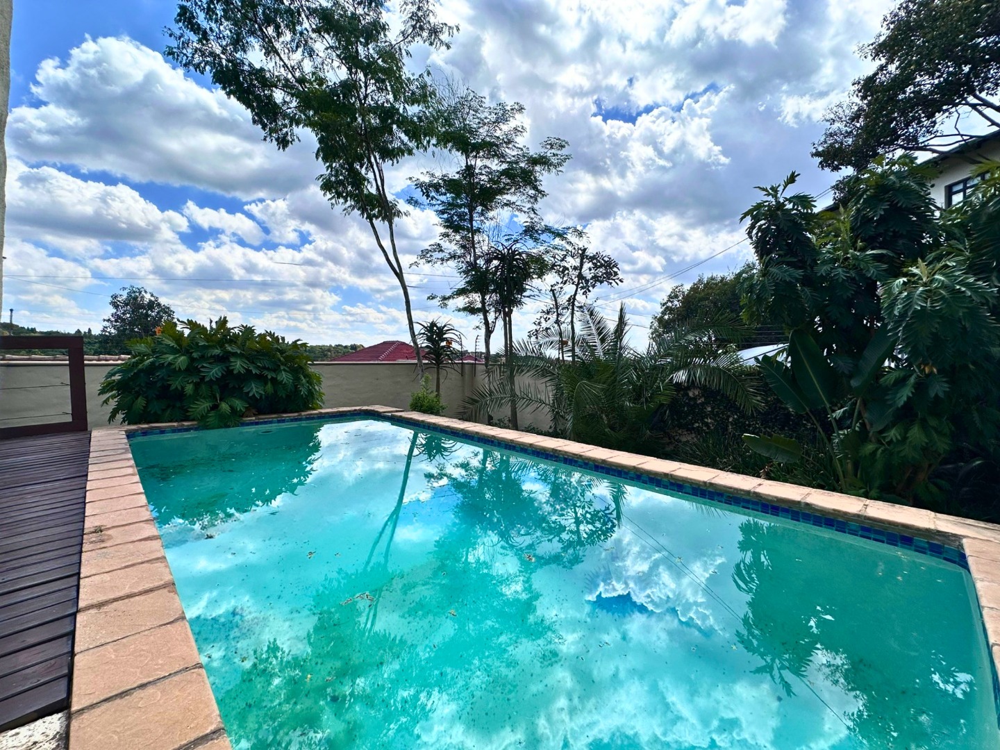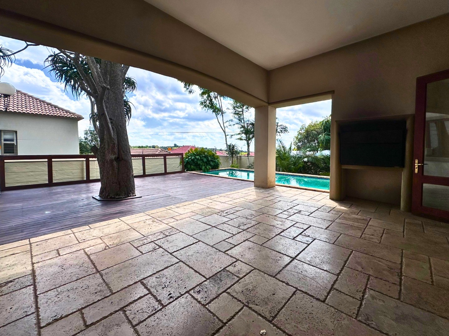 The ground floor is centered around a sleek open plan kitchen with ample cupboard space, a walk-in pantry and a separate scullery with room for all wet appliances. The kitchen flows into the dining and living areas, creating a practical layout for everyday family life. Two lounges, both with fireplaces, add flexibility and warmth, while the covered veranda with built-in braai opens beautifully from the lounge through wooden glass doors, overlooking the sparkling pool and private garden setting.