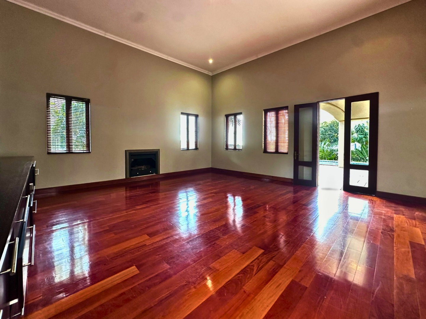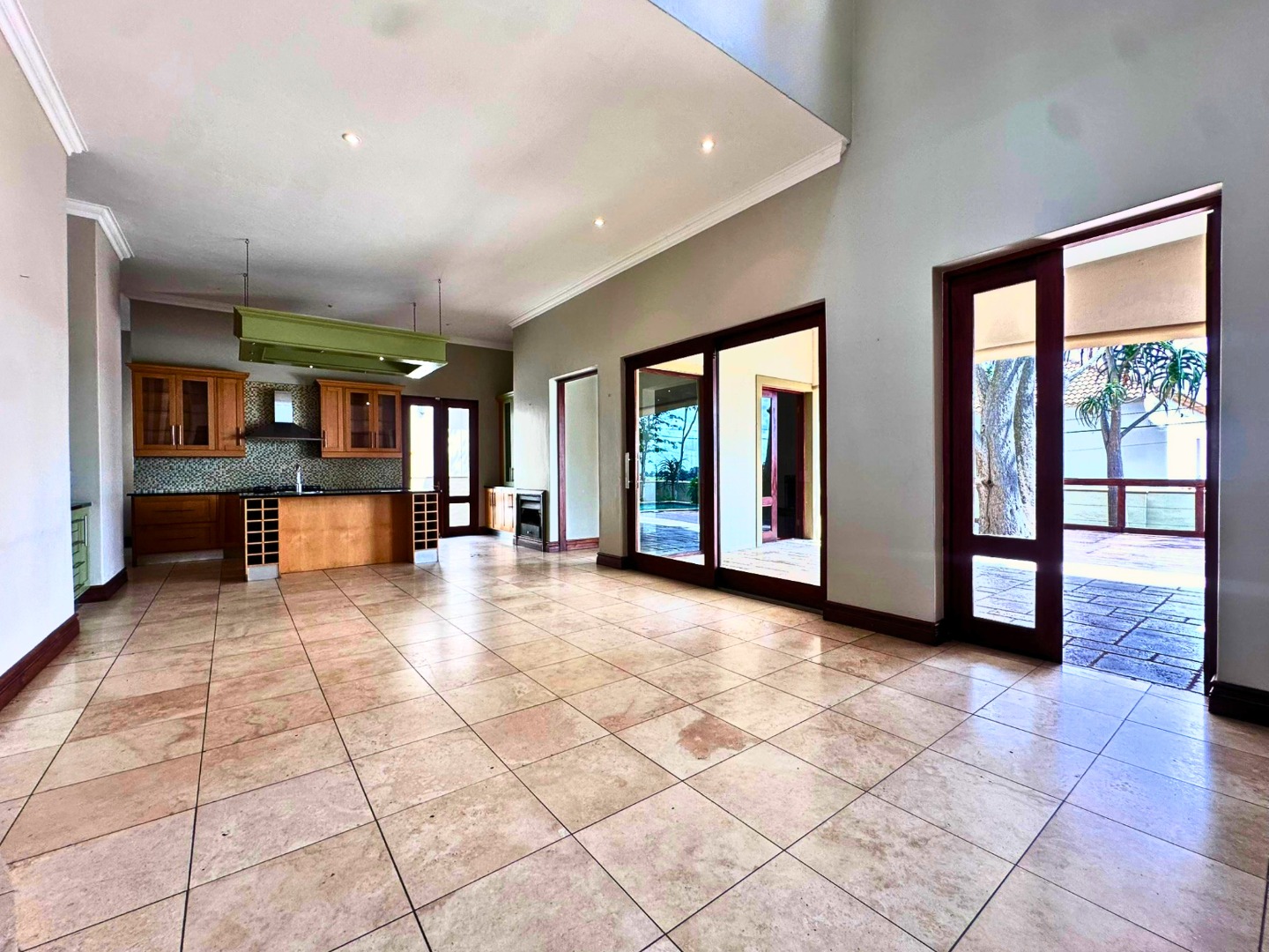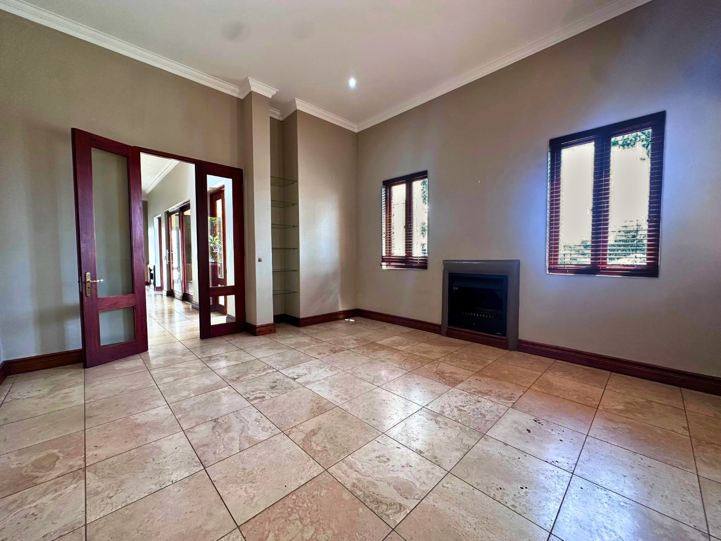 The ground floor is centered around a sleek open plan kitchen with ample cupboard space, a walk-in pantry and a separate scullery with room for all wet appliances. The kitchen flows into the dining and living areas, creating a practical layout for everyday family life. Two lounges, both with fireplaces, add flexibility and warmth, while the covered veranda with built-in braai opens beautifully from the lounge through wooden glass doors, overlooking the sparkling pool and private garden setting.