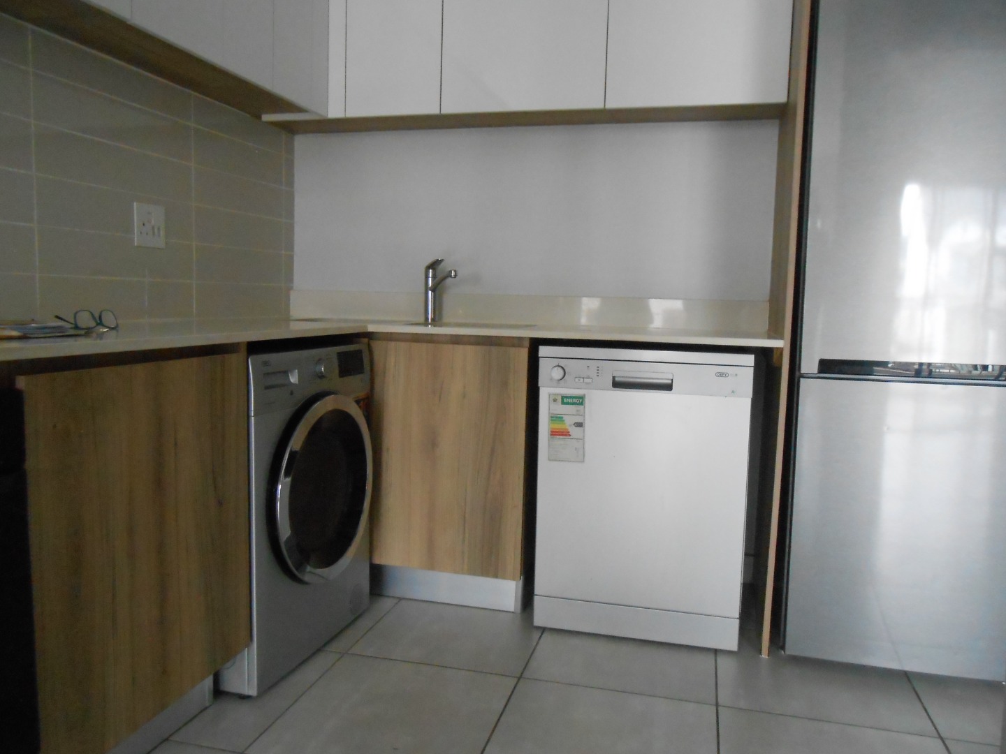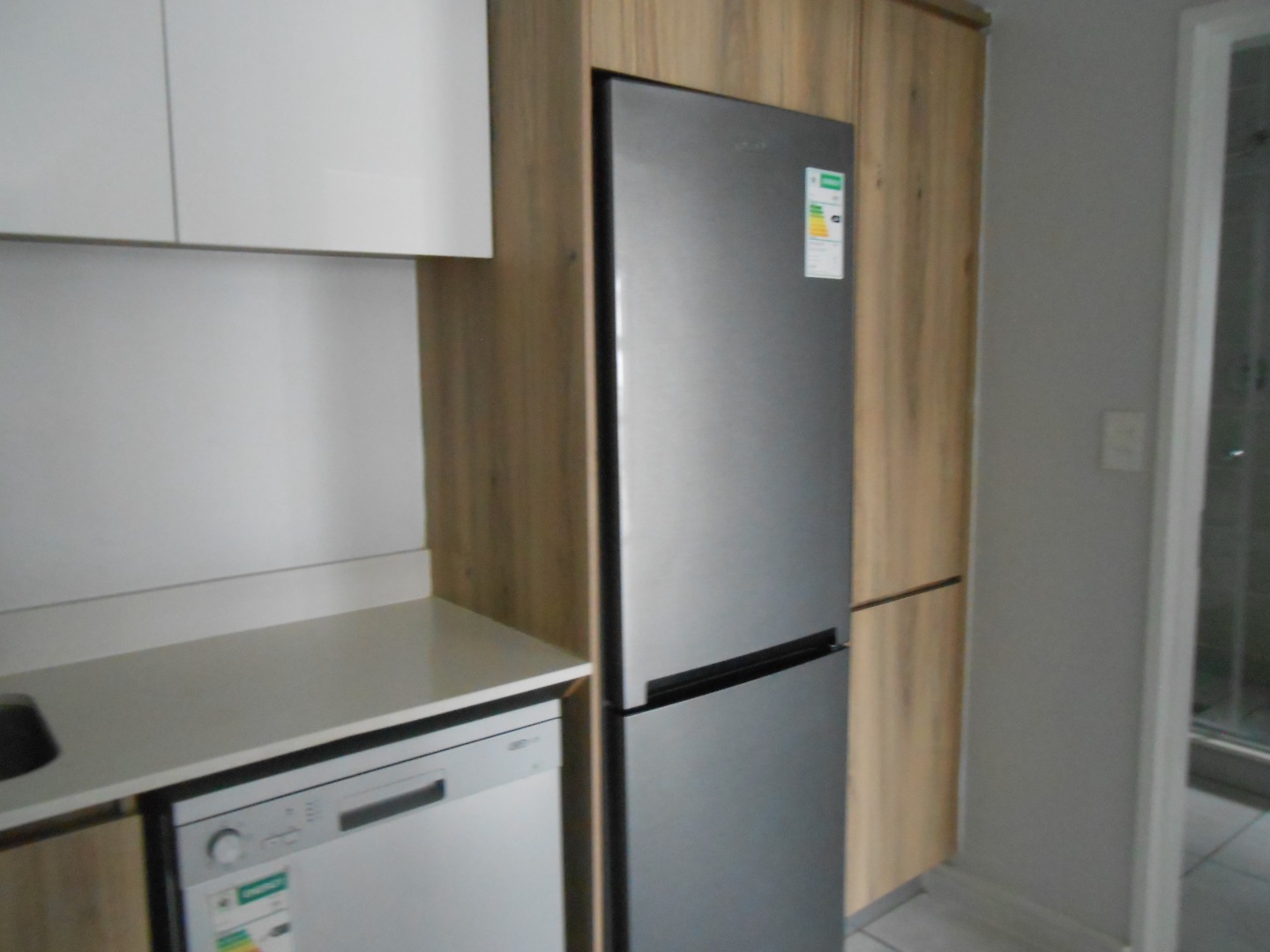 The well-appointed kitchen is a highlight, featuring modern two-tone cabinetry, light countertops, and integrated appliances including a washing machine, dishwasher, refrigerator, electric hob, and extractor fan. The sleek bathroom boasts neutral grey tiling, a glass-enclosed walk-in shower, and a vanity, ensuring a clean and functional space. Tiled floors and light walls throughout contribute to a fresh, modern aesthetic, perfect for a lock-up-and-go lifestyle.